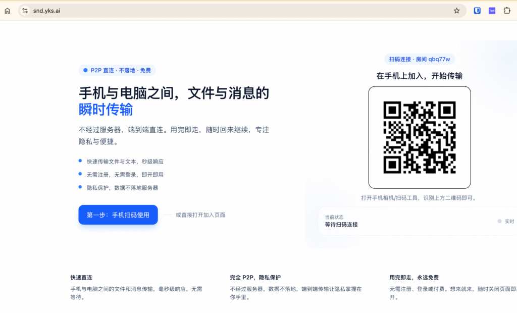 打开地址:https://snd.yks.ai 使用手机扫电脑浏览器上呈现的二维码,等建立链接后,就可 以在手机和电脑上相互进行信息传输了